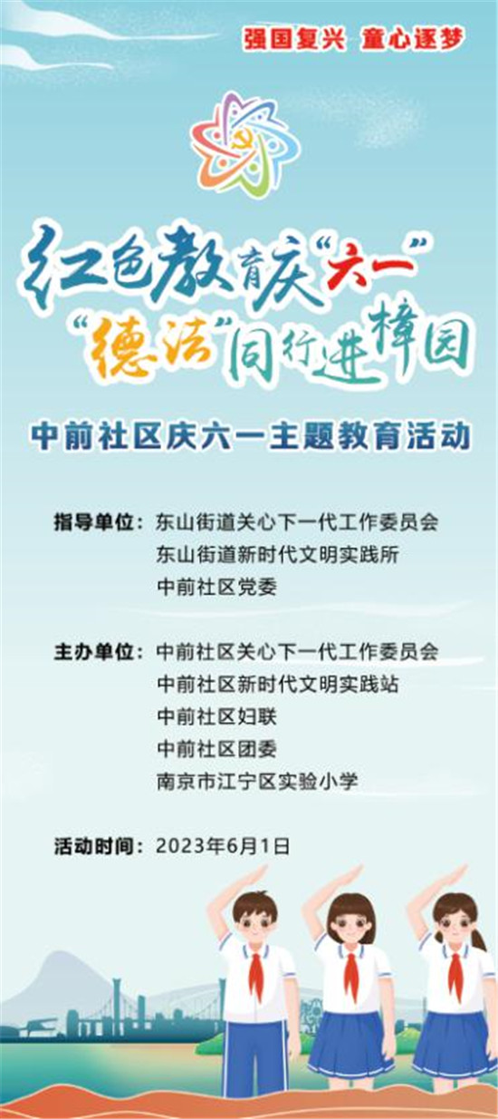 為貫徹落實黨的二十大精神,弘揚以偉大建黨精神為源頭的中國共產(chǎn)黨人精神譜系,深入開展社會主義核心價值觀宣傳教育,深化愛國主義、集體主義、社會主義教育、著力培養(yǎng)擔當民族復(fù)興大任的時代新人。“六一”兒童節(jié)當天,在南京市江寧區(qū)東山街道關(guān)工委、東山街道新時代文明實踐所的指導(dǎo)下,東山街道中前社區(qū)關(guān)工委、中前社區(qū)新時代文明實踐站聯(lián)合大黨委成員單位江寧實驗小學(xué),開展了“紅色教育慶‘六一’ “德法”同行進樟園”主題教育活動。