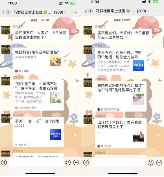 時代飛速發(fā)展,閱讀的方式也日新月異。每天上午,馬群社區(qū)的全民閱讀志愿者都會準(zhǔn)時在“掌上云”社區(qū)群中與大家分享經(jīng)典閱讀素材:一本好書、一些生活妙招亦或是一條健康養(yǎng)生知識......讓大家隨時隨地暢游知識的海洋,收獲閱讀的饋贈。