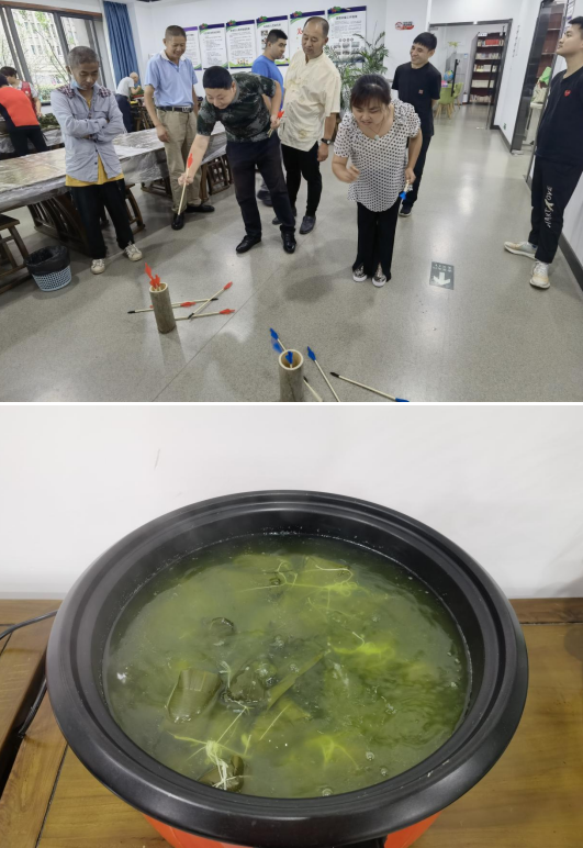 在等待粽子煮熟的過程中,志愿者帶領(lǐng)殘友們進(jìn)行投壺和射五毒游戲。
