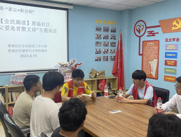 2023年6月18日,南京市棲霞區(qū)馬群街道果場(chǎng)社區(qū)全民閱讀小組聯(lián)合社區(qū)教育中心,組織社區(qū)“齊益果”積分制志愿者、鐘山學(xué)院學(xué)生、社區(qū)青少年在社區(qū)一樓活動(dòng)室開(kāi)展了本月全民閱讀交流會(huì)。本次全民閱讀活動(dòng)旨在父親節(jié)來(lái)臨之際,通過(guò)文字書(shū)籍的力量,讓青少年感受到父愛(ài)的“潤(rùn)物細(xì)無(wú)聲”,促進(jìn)家庭和諧。