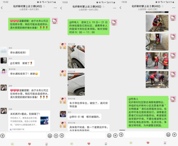 “溫馨提醒: 由于水務(wù)公司正在搶修水管,稍后可能會造成停水請大家提前做好儲水準(zhǔn)備!”、“退休工人 19 日- 21 日的體檢報(bào)告已到社區(qū),請攜帶本人的醫(yī)??ǖ缴鐓^(qū)來領(lǐng)取。每天領(lǐng)取時(shí)間9: 00-11:00”、“化纖新村社區(qū)聯(lián)合海賦電建物業(yè)并組織化纖新村小區(qū)志愿者開展文明樓道”清掃志愿服務(wù)活動。”.......社區(qū)工作人員在掌上云微信群里及時(shí)發(fā)布實(shí)時(shí)信息,讓居民們擁有一個(gè)快速、高效的接收信息渠道。化纖新村推行“線上+線下”新型社區(qū)管理模式。社區(qū)居民可以通過掌上云社區(qū)微信群及時(shí)了解社區(qū)的最新信息和服務(wù),也可以隨時(shí)向社區(qū)反映問題和建議,社區(qū)工作人員加強(qiáng)與群眾溝通互動,居民提出的問題在短時(shí)間內(nèi)就能得到反饋解答。
