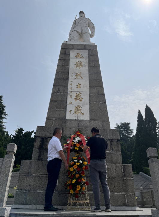 隨后各位黨員踏上前往烈士紀(jì)念碑的臺(tái)階,在紀(jì)念碑前敬獻(xiàn)花圈,由社區(qū)黨委書(shū)記譚勇、社區(qū)黨委副書(shū)記馬志強(qiáng)為其整理挽聯(lián),各位黨員面對(duì)威嚴(yán)屹立的英雄墓碑,大家肅穆而立,默哀致敬,表達(dá)對(duì)革命先烈的崇敬之情。