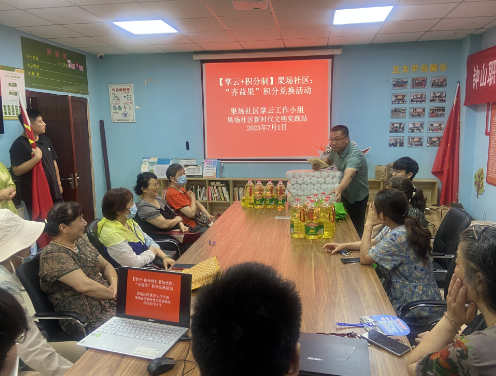 2023年7月1日下午,南京市棲霞區(qū)馬群街道果場社區(qū)掌云+積分制工作小組依托社區(qū)新時代文明實踐站,開展年中“齊益果”積分兌換活動。社區(qū)“齊益果”積分制志愿者、黨員樓棟長、居民小組長參與兌換,這也是果場社區(qū)在今年下半年工作開展前激發(fā)居民、黨員積極參與社區(qū)基層治理熱情的一次動員。