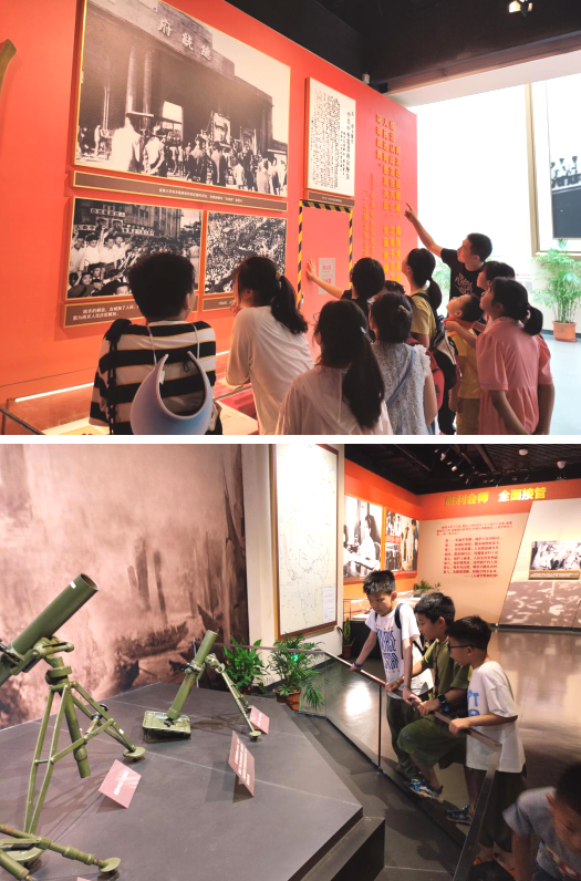踏入南京渡江勝利紀念館,映入眼簾的是被譽為解放南京“渡江第一船”的 “京電號”,在渡江戰(zhàn)役中,它冒著敵人的炮火,將6000多名解放軍指戰(zhàn)員安全渡過長江,包括鄧小平、陳毅等將領,立下了赫赫戰(zhàn)功。走進館內(nèi),解放軍渡江前行的大型浮雕呈現(xiàn)在大家眼前,生動地展示了解放軍渡江的壯麗場景。青少年們聚集在“五老”志愿者毛肥生身邊,聽爺爺講起渡江戰(zhàn)役這段重要歷史,在爺爺?shù)纳鷦又v述中,大家仿佛親眼目睹了百萬雄師過大江那壯觀的場景。隨后,大家參觀了各個展廳,大量的圖片、實物和文字資料重現(xiàn)了那段革命歷史,進一步激發(fā)了青少年們的愛國主義熱情。