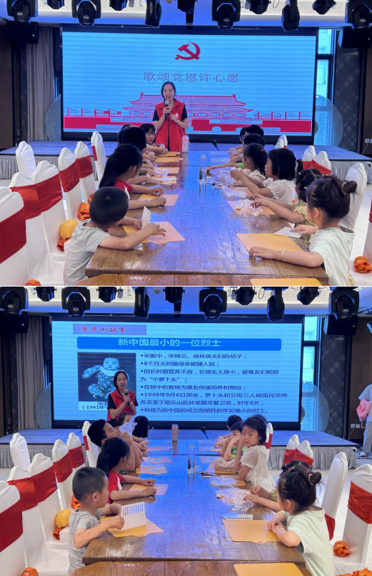活動現(xiàn)場,志愿者老師通過ppt為孩子們展示黨旗、黨徽,介紹了圖案的意義。隨后,用通俗易懂的語言、生動形象地講述了革命前輩們不怕犧牲、英勇奮戰(zhàn)的黨史、新中國最小的一位烈士宋振中的故事,帶領(lǐng)孩子們深入了解了中國共產(chǎn)黨從誕生到不斷發(fā)展壯大的光輝歷程。讓孩子們對革命烈士的敬仰之情愈加濃烈,對如今幸福生活的來之不易更是充滿感恩。孩子們津津有味聽著歷史故事,并積極提出自己不懂之處,老師們耐心一一解答。