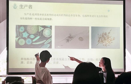 海洋生態(tài)系統(tǒng)是全球最重要的生態(tài)系統(tǒng),人類的生存和發(fā)展與海洋息息相關(guān)。在海洋生態(tài)科普上,曾雪鈺首先用動畫引出了海洋生態(tài)系統(tǒng)的概念,然后著重介紹了海洋生態(tài)系統(tǒng)的生物成分和非生物成分。在曾雪鈺同學(xué)的引導(dǎo)下,小朋友們認識了許多微小精妙的浮游植物,在一輪輪問答中,小朋友們了解了不少海洋動物之“最”,也展示了自己豐富的知識儲備和較高的海洋素養(yǎng)。明明一身綠,為什么被稱為“紅樹林”?海藻場有什么作用?珊瑚蟲和珊瑚是什么關(guān)系?在解決一個又一個問題的過程中,小朋友們認識到海洋生態(tài)系統(tǒng)的多樣性與重要性,并與老師一起探討海洋生態(tài)系統(tǒng)面臨的問題與解決之道。