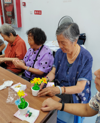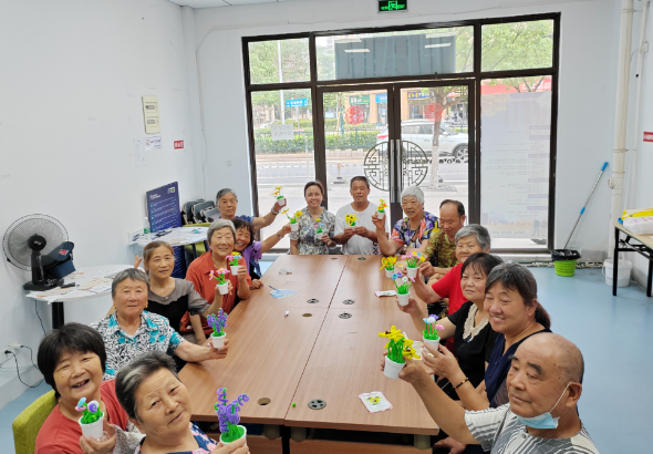 前期報名階段,老人們就十分熱情主動,活動當日,一早上就來到中心簽到。唱歌是一種精神上的鍛煉,它有益于平衡生活情緒,改善健康狀態(tài)和排憂解愁,做手工有利于減輕壓力和疲勞?,F(xiàn)場,大家一邊齊唱《紅星照我去戰(zhàn)斗》,一邊完成了手工盆栽制作,用歡快的歌聲展示積極的生活態(tài)度,用小小的盆栽活絡鄰里關系,增進居民友誼。老人們笑容滿面,和諧友善社區(qū)關系由此而來。