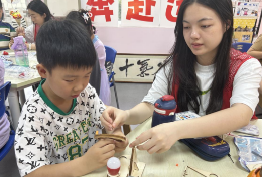 本次活動提前在轄區(qū)內(nèi)招募了10名返鄉(xiāng)大學生團員志愿者,志愿者們?yōu)樾∨笥褌儙砹藙?chuàng)意潛水艇、手搖發(fā)電機、吃幣機器人、液壓挖掘機等創(chuàng)意小實驗;在實驗的過程中,志愿者老師們用通俗幽默的語言,給小朋友們講解各種物理趣味知識,并且?guī)е∨笥褌円黄饎邮种谱飨嚓P的小實驗,在整個動手制作的過程中,高深的物理知識一下子變得非常親切易懂。