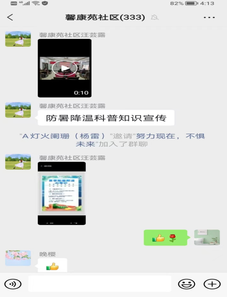 “趁“熱”,這份防暑降溫指南請查收.......”居民群內,社區(qū)工作人員通過友情提醒、鏈接推送、圖文科普、視頻宣教、互動分享等形式為居民們普及了熱射病相關知識以及使用的防暑知識,提醒居民防暑重在預防,要避免在日照強烈的時間段劇烈運動;外出要做好防護,盡量走在陰涼處;多喝水補充有機鹽分;居家空調溫度不宜太低;家中可常備仁丹、藿香正氣水等防暑藥品;如高溫引發(fā)身體不適,應及時就診治療。“夏季莫貪涼,謹防空調病”、“我家就經常熬些綠豆湯”、“冰鎮(zhèn)食品注意少吃”、“外出可隨身攜帶清涼油、藿香正氣等防暑藥品”、“西紅柿、絲瓜、苦瓜也是不錯的選擇”......居民們紛紛分享道。