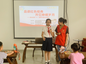 活動伊始,志愿者首先向孩子們宣講了“八一”建軍節(jié)的意義、革命先輩保家衛(wèi)國抗日戰(zhàn)爭的光榮事跡,激發(fā)孩子們學(xué)習(xí)革命精神、珍惜來之不易的美好生活,從小樹立擁軍愛國的思想理念。緊接著,志愿者帶領(lǐng)孩子們一起閱讀《紅色少年的故事》、《鐵道游擊隊(duì)》、《兩個小八路》等紅色書籍,并在孩子們閱讀之后邀請他們上臺發(fā)表自己的感想。為了鼓勵孩子們大膽表達(dá),志愿者還給孩子們準(zhǔn)備了小禮物。