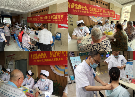 為慶祝第六屆2023年“8.19”中國(guó)醫(yī)師節(jié),進(jìn)一步激勵(lì)廣大醫(yī)務(wù)工作者,大力弘揚(yáng)醫(yī)者仁心的崇高精神,構(gòu)建和諧醫(yī)患關(guān)系,更好的為轄區(qū)居民健康服務(wù),2023年8月8日上午,南京市江寧區(qū)祿口社區(qū)醫(yī)院聯(lián)合南京江寧醫(yī)院在祿口街道永欣公寓祿樂(lè)家園大廳舉行慶祝第六屆“中國(guó)醫(yī)師節(jié)”義診活動(dòng)。