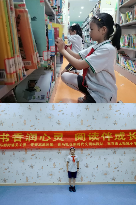 接著,隊(duì)員們迫不及待地投身到志愿者工作中,開始在書庫不同區(qū)域分工合作整理書籍。他們穿梭于一排排書架之間,有條不紊地把凌亂的圖書擺放整齊,按照?qǐng)D書類別將其排序和歸位。他們時(shí)而舉高時(shí)而下蹲,在吹著絲絲涼氣的空調(diào)房里,竟也滿頭大汗。時(shí)間不知不覺過去了,忙得不亦樂乎的小志愿者們看著自己的勞動(dòng)成果,心情像浪花一樣歡騰!