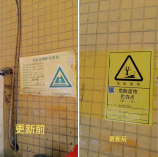 果場社區(qū)轄區(qū)內(nèi)涉及維修行業(yè)三家,巡查中,工作人員確認(rèn)已有兩家已對固廢危廢儲存間警告標(biāo)識更新及張貼,剩余一家已下載相關(guān)固廢危廢集中收集單位轉(zhuǎn)發(fā)的固廢危廢儲存間警告標(biāo)識,暫未制作,工作人員督促該單位盡快制作完成并張貼到位。