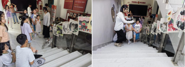 在盛大的結(jié)業(yè)典禮上,樓梯的扶手兩側(cè)陳列著孩子們創(chuàng)作的一幅幅栩栩如生作品。志愿者老師們向?qū)W員們的家長們指出,他們的孩子們在這段時間里取得了巨大的學(xué)習(xí)進(jìn)步,真正有所收獲,學(xué)有所成。