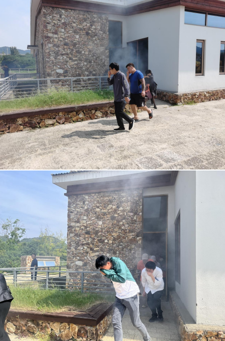 現場還根據培訓內容,趁熱打鐵,進行緊急疏散及消防演練,通過燃放煙霧彈,模擬失火逃生,所有人均按照培訓所講,掩好摳鼻,按照逃生路線安排,彎腰逃生,到指定地點集合,進行消防演練。在消防大隊同志的指導下,大家按照一搖二拔三噴的使用要領,對干粉滅火器進行了滅火實操。