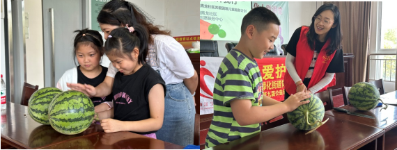 聽一聽,辨一辨,小朋友們親身體驗不同西瓜的顏色、瓜蔓,拍擊聲,在熱烈的投票過后現(xiàn)場切開和大家揭秘,共享美味西瓜。
