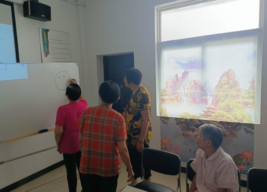 游戲二,接力繪畫。老人們分成兩組,接力繪畫,一組畫男生,一組畫女生。分好組,老人們分工起來:“等會(huì)兒你畫鼻子啊,那我畫嘴巴,你們誰畫手和腳啊?”