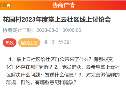 花園村充分利用掌上云社區(qū)平臺,做好黨建引領(lǐng)工作,拉近干群之間的距離,做好基層工作,更好為民服務(wù)?;▓@村希望通過此次討論會,了解黨員群眾所需所想,共建幸?;▓@。