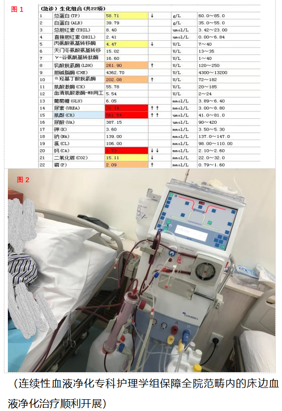經(jīng)病友推薦,得知江寧中醫(yī)院神經(jīng)外科在腦出血診治方面經(jīng)驗(yàn)豐富,家屬一番商量后,將患者送往該院治療??紤]到患者既往有尿毒癥病史,急查腎功能,提示肌酐500umol/L以上(圖1)。神經(jīng)外科醫(yī)生聯(lián)系腎病科宋揚(yáng)主任會診后,鑒于患者腦出血術(shù)后,且行動(dòng)不便,建議患者行床邊無肝素透析方案(圖2),每隔一天執(zhí)行一次。然而,透析時(shí)又遇新的困難,患者左前臂動(dòng)靜脈瘺處無法進(jìn)行滿意透析,經(jīng)血透室王桂花護(hù)士長及腎內(nèi)科醫(yī)護(hù)人員共同協(xié)作,行右下肢股靜脈穿刺,最終成功實(shí)施透析。定期復(fù)查腎功能,提示腎功能改善明顯。