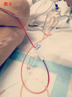 正當(dāng)大家以為腎功能改善后,患者的狀況會一路好轉(zhuǎn),然而,患者并未出現(xiàn)想象中的明顯改善。復(fù)查血細(xì)胞分析,發(fā)現(xiàn)患者中度貧血,且患者仍然呈持續(xù)性頭痛及精神萎靡。針對這一情況,神經(jīng)外科及腎病科的專家們又開展了詳細(xì)地交流討論,并提出了治療建議:對患者施行腰大池引流術(shù)(圖3),減少出血對腦血管的痙攣刺激以緩解頭痛癥狀;每日輸注2個(gè)單位懸浮紅細(xì)胞、口服鹿血晶1—2g/日,改善血紅蛋白至100g/L以上;通過鼻飼管,每日輸注能全力兩瓶,改善患者營養(yǎng)狀況;繼續(xù)隔日床邊血液透析。