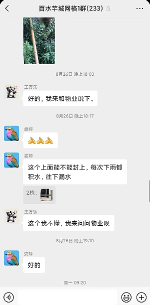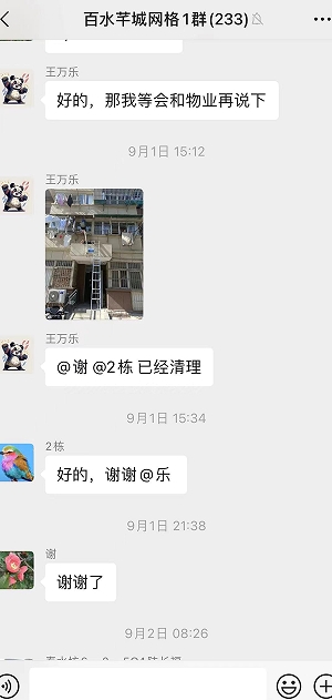 百水芊城社區(qū)網(wǎng)格員在“掌上云”微信群看到訴求后立刻前往現(xiàn)場(chǎng)查看,發(fā)現(xiàn)此處平臺(tái)日常保潔根本無(wú)法察覺(jué)到,只有住戶自己能看到,現(xiàn)場(chǎng)正如居民所述一致,確實(shí)是一處衛(wèi)生死角。當(dāng)即網(wǎng)格員聯(lián)系物業(yè)師傅帶上梯子和相關(guān)清掃工具,爬上平臺(tái)后把積水疏通,并將、雜草、淤泥、垃圾一同清理干凈,隨后網(wǎng)格員在“掌上云”微信群里告知訴求人,說(shuō)明該處問(wèn)題成功順利解決,社區(qū)及時(shí)有效的處理得到居民的一致認(rèn)可。