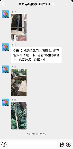近日,棲霞區(qū)馬群街道百水芊城“掌上云”微信群陸續(xù)接到居民訴求信息,住戶陽(yáng)臺(tái)衛(wèi)生死角存在積水及雜草叢生現(xiàn)象,夏天水質(zhì)發(fā)臭,且極易滋生蚊蟲(chóng),影響日常生活,希望居委會(huì)安排人員幫忙清理。
