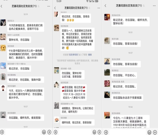 2023年9月18日星期一,當(dāng)芝嘉花園社區(qū)早上響起防控警報的那一刻,在掌上云的微信群里,大家不約而同的紛紛發(fā)表自身的感悟,提醒讓我們銘記歷史,勿忘國恥,自強(qiáng)不息。繼承先烈遺志,向烈士致敬,是您喚醒了沉睡的中國,是您用鮮血開啟了一個新的紀(jì)元,您們是中華民族的驕傲,是中華民族的象征。我們更應(yīng)當(dāng)珍惜此刻的生活,為祖國的繁榮昌盛而奮斗!