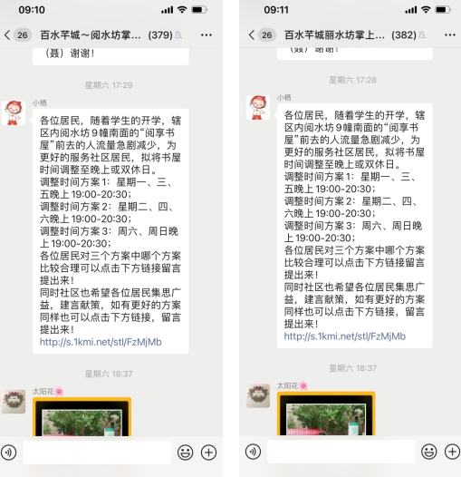 為更好的服務(wù)社區(qū)居民,以社區(qū)讀者所盼、所需為導(dǎo)向,有針對性地滿足群眾文化需求,百水芊城社區(qū)運(yùn)用“掌上云社區(qū)”業(yè)務(wù)管理平臺,通過“小棲”機(jī)器人向小區(qū)微信群推送百水芊城小區(qū)“閱享書屋”的開放調(diào)整協(xié)商管理通知,通過線上協(xié)商留言方式邀請轄區(qū)居民集思廣益,建言獻(xiàn)策,在選擇好的開放方案同時也可以提出其他的方案。