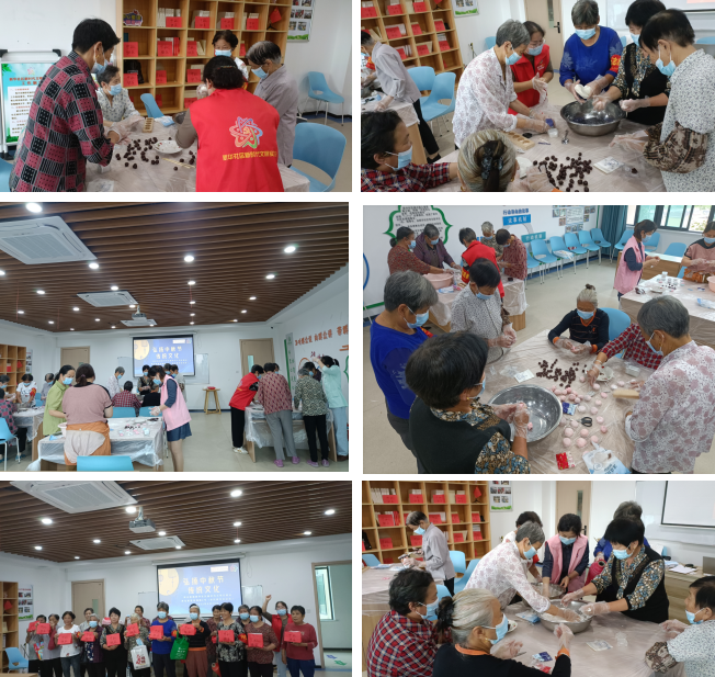 接下來(lái)是制作月餅環(huán)節(jié),志愿者分別介紹餅皮、餡料、模具等制作材料的用量和制作方式,并詳細(xì)指導(dǎo)月餅的制作過(guò)程。老人們摩拳擦掌,動(dòng)手揉餅皮、加餡料、包月餅、放入模具按壓成型,一邊探討著月餅的制作方法,一邊互相傳遞鮮花、花生、葫蘆、小兔子等形狀的月餅?zāi)>摺=?jīng)過(guò)近一小時(shí)的制作,一個(gè)個(gè)色澤鮮艷、小巧玲瓏的月餅呈現(xiàn)在每個(gè)人的手中,并由社區(qū)志愿者組織集體合影留念,定格美好瞬間。