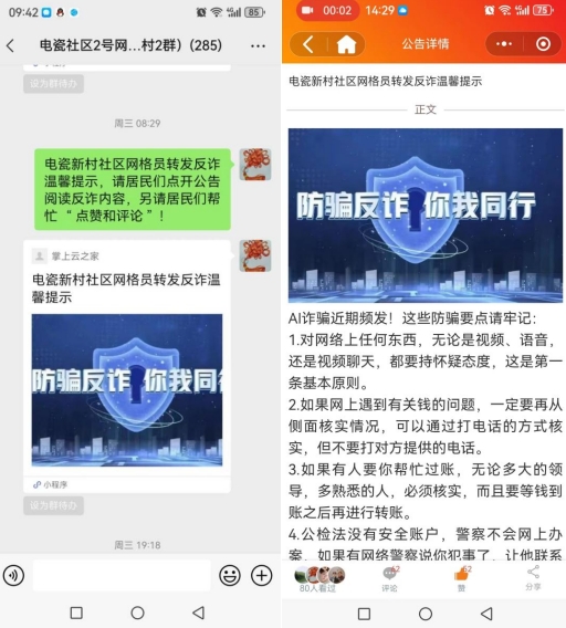 為了更好地傳遞宣傳信息,電瓷新村社區(qū)利用線上掌上云社區(qū)網(wǎng)格群的推廣方式,廣泛宣傳防范電信網(wǎng)絡(luò)詐騙的知識和技巧。通過發(fā)布相關(guān)知識文章、轉(zhuǎn)發(fā)預(yù)防警示信息等方式,社區(qū)居民可以隨時隨地獲取相關(guān)的防范詐騙的信息。