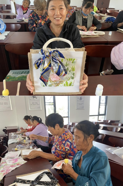 而后,志愿者們通過PPT和視頻的形式,向大家展示了手工制作蝶骨巴包的方法和注意事項。每人都收到了一個帆布包制作材料包,志愿者們引導(dǎo)大家自行發(fā)揮想象力,激發(fā)創(chuàng)意,開始進(jìn)行制作。一雙雙靈巧的雙手在活動室里翻飛,一張張笑臉在每個人的臉龐綻放,充滿了童真與喜悅。志愿者們不辭辛勞地幫助每一位需要幫助的村民,耐心地解答他們遇到的問題。大家相互之間分享了制作過程中的心得和體會,互相鼓勵和贊美。
