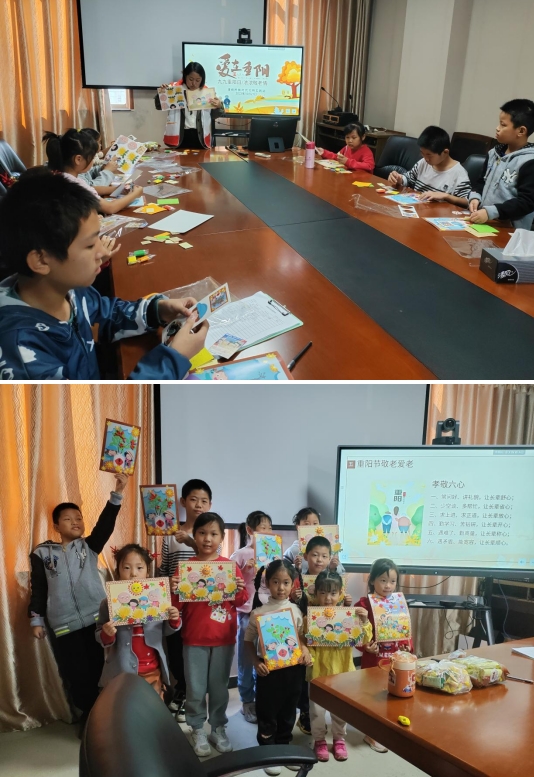 活動(dòng)現(xiàn)場,志愿者通過PPT、視頻等形式,向孩子們介紹了重陽節(jié)的起源、傳說與習(xí)俗等知識(shí),尊老敬老是中華民族的傳統(tǒng)美德,她號(hào)召每一位同學(xué)都用實(shí)際行動(dòng)向老人們獻(xiàn)上自己的一份愛心。隨后,進(jìn)行到手工制作環(huán)節(jié),孩子們時(shí)而手拿畫筆,認(rèn)真思考構(gòu)圖,時(shí)而低頭作畫。那專心致志的樣子,宛如一個(gè)個(gè)小畫家。經(jīng)過約半個(gè)小時(shí)的現(xiàn)場創(chuàng)作,一幅幅生動(dòng)有趣的作品展示在大家面前,贏得了大家的稱贊。大家紛紛拿起自己的作品合影留念,小臉上都洋溢著喜悅的笑容。
