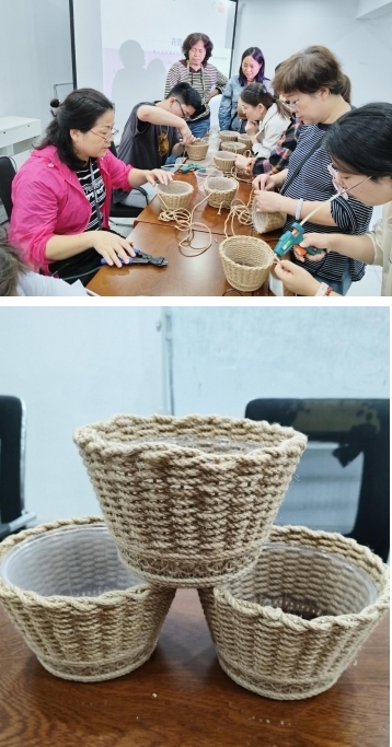 活動現(xiàn)場,社區(qū)工作人員、志愿者向居民們講解苧麻編織花籃的方法、步驟,并進行了示范,居民們認真聽講解、仔細看示范,學習其中要領。在工作人員與志愿者的指導下,大家開始動手制作,大家先用膠槍將麻繩粘在托盤上,再用麻繩一圈一圈地纏繞花桿,居民們互幫互助,團結(jié)友愛。一邊編織著花籃一邊嘮家常,回憶過去,居民之間交流與互動,樂趣無窮。