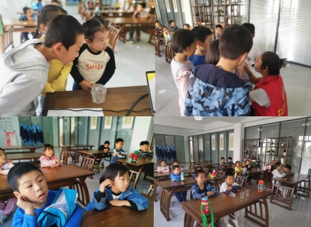 活動開始,志愿者問孩子們“你們知道鹽會跳舞嘛?”,孩子們一個個瞪大眼睛,充滿好奇的望向志愿者,緊接著志愿者拿出道具玻璃杯、保鮮膜、鹽。一切準備就緒后,志愿者邀請三位小朋友上臺來觀察,孩子們目不轉(zhuǎn)睛的看著鹽,隨著志愿者說話的聲音,“鹽真的在跳舞哎”臺上的孩子歡呼到。