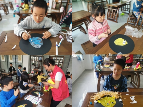 活動最后,志愿者陪孩子們一起利用氣泡膜繪制下蛋的小雞,志愿者先講解繪制的要點,緊接著孩子們便認真的在紙上畫出小雞的身體,剪好再貼在畫紙上,然后涂上自己喜歡的顏色,再用彩泥做上眼睛、嘴巴、翅膀、雞冠、雞蛋等,最后粘上雞窩,一幅幅創(chuàng)意作品就完成了,看起來都栩栩如生。