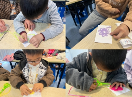 繪本故事結(jié)束后,社區(qū)志愿者繼續(xù)帶領(lǐng)小朋友們開始了“一圈一畫”創(chuàng)意毛線畫手工制作。小朋友們原先只知道毛線可以用來織毛衣,但是在今天,小朋友們利用毛線,在卡紙上一筆一筆勾勒出了屬于自己的毛線畫作品。在這些充滿童趣的作品中,我們看見了一枚桃心,一朵紫色的小花,一條在水底游來游去的小魚......每個作品都展現(xiàn)了孩子們的獨(dú)特的創(chuàng)造力,孩子們在過程中感受創(chuàng)造的樂趣與美好。