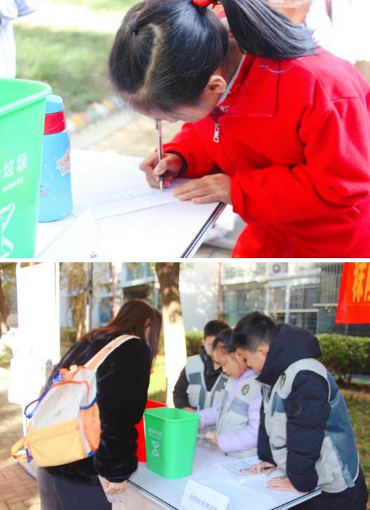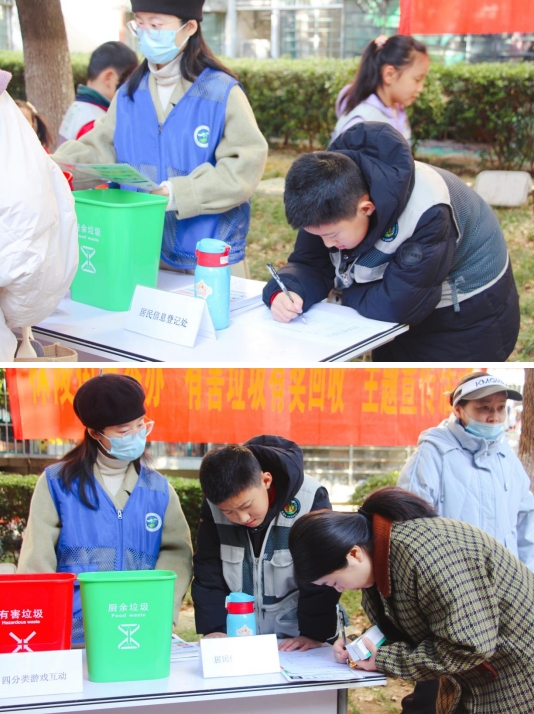 本次活動(dòng)共設(shè)置4個(gè)攤位,分別是:四分類游戲互動(dòng)、居民信息登記處、有害垃圾回收處、志愿者招募處。