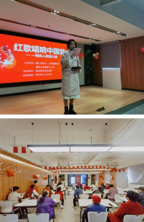 2023年12月3日是第32個(gè)國際殘疾人日,在此到來之際,由雨花街道能仁里社區(qū)、共青團(tuán)路社區(qū)、微笑之光殘疾人之家聯(lián)合主辦,南京綠絲帶公益社承辦的主題為“紅歌唱響中國夢”殘疾人歌唱大賽于鄰里薈五樓圓滿完成,來自轄區(qū)(能仁里社區(qū)、共青團(tuán)路社區(qū))的20幾名殘疾人及家屬參與了本次活動(dòng)。其中,能仁里社區(qū)郭星敏主任、共青團(tuán)路社區(qū)楊玉彬主任、南京綠絲帶理事袁鳳蘭女士出席本次活動(dòng)并擔(dān)任大賽評(píng)委。其中能仁里社區(qū)郭星敏主任上臺(tái)致辭給予本次歌唱大賽極大的肯定和期許。賽中,每一位殘疾人都以熱情飽滿的狀態(tài)演唱自己最拿手的經(jīng)典紅歌,唱響心中中國夢,共同祝福祖國繁榮昌盛,展現(xiàn)了新時(shí)代殘疾人自信自強(qiáng)的獨(dú)特風(fēng)采。