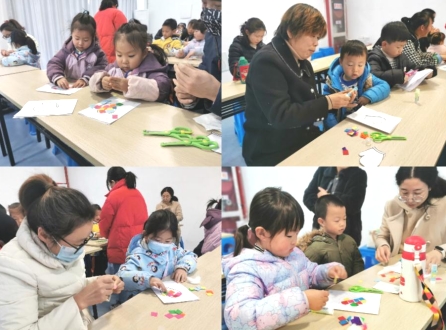 繪本故事結(jié)束后,社區(qū)志愿者繼續(xù)帶領(lǐng)小朋友們開始了手工——花格子手套的制作。小朋友們?cè)诎咨目埳?,粘上一塊一塊彩色的不織布方塊,又貼上棉花當(dāng)作毛茸茸的邊。這樣一副色彩活潑,看上去又暖和的手套手工就完成了!在這樣一個(gè)寒冷的冬天里,一副手套就讓孩子們感受到溫暖和幸福。