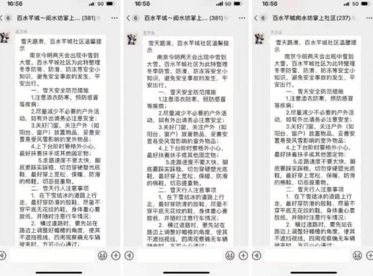 考慮到外出居民出行安全,社區(qū)網(wǎng)格員定時(shí)巡查小區(qū)積雪情況,以防老舊設(shè)施及樹(shù)木積雪較多造成垮塌傷人,同時(shí)社區(qū)通過(guò)“掌上云”微信群發(fā)布雪天安全防范措施、雪天行人注意事項(xiàng)、雪天駕車注意事項(xiàng)等,提醒居民注意雪天出行安全!