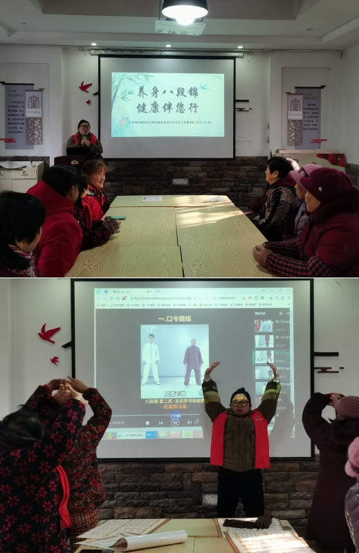 為進(jìn)一步倡導(dǎo)樹立新時代文明健康生活方式,引導(dǎo)村民科學(xué)健身,12月26日,南京市江寧區(qū)淳化街道茶崗村新時代文明實踐站聯(lián)合紅葉社工,在大花區(qū)議事園開展“養(yǎng)身八段錦 健康伴您行”健身普及教學(xué)活動?;顒又荚诤霌P(yáng)中華傳統(tǒng)養(yǎng)生文化,倡導(dǎo)文明健康的生活方式,得到了村民的積極響應(yīng)和參與。