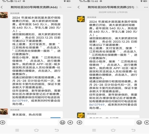歲末年初,2024年度城鄉(xiāng)居民基本醫(yī)療保險集中繳費工作正如火如荼地展開。南京市江寧區(qū)谷里街道荊劉村為確保轄區(qū)內(nèi)的每一位老百姓享受到2024年的醫(yī)療保障待遇,網(wǎng)格員們通過線上和線下宣傳相結(jié)合的方式進(jìn)行2024年城鄉(xiāng)居民基本醫(yī)療保險繳費宣傳。