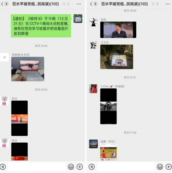當(dāng)晚,百水芊城社區(qū)黨委通過“掌上云”微信群里,號召平日里上班年輕黨員及腿腳行動不便老黨員及時參與線上學(xué)習(xí),收看《榜樣8》專題節(jié)目,并在群里簽到發(fā)圖片和視頻,掀起學(xué)習(xí)新熱潮,引導(dǎo)廣大黨員見賢思齊,追尋榜樣足跡、汲取榜樣力量。
