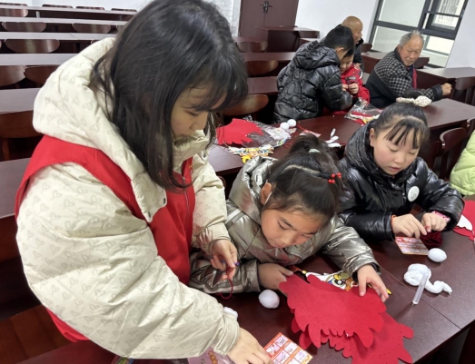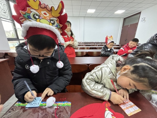 除了閱讀和討論,活動(dòng)還為孩子們準(zhǔn)備了手工制作環(huán)節(jié)。志愿者們發(fā)放了“頭龍帽”制作材料包,引導(dǎo)孩子們親自動(dòng)手制作頭龍帽。在志愿者的耐心指導(dǎo)下,孩子們發(fā)揮想象力,認(rèn)真制作著屬于自己的頭龍帽。不一會(huì)兒,一個(gè)個(gè)精美的頭龍帽就完成了。孩子們戴上自己制作的頭龍帽,臉上洋溢著自豪和喜悅。此外,活動(dòng)還特別設(shè)置了寫下新年期待的環(huán)節(jié)。志愿者們邀請(qǐng)孩子們用紙筆寫下自己的新年愿望和期待?;顒?dòng)最后,柏墅村為孩子們準(zhǔn)備了龍年主題公仔盲盒抽取,讓孩子們感受著迎接新年的喜悅和美好。