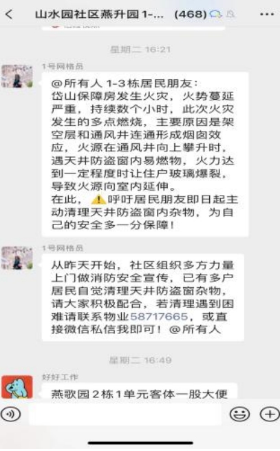 “各位居民,通風(fēng)井和樓道內(nèi)雜物亂堆亂放,這不僅影響了小區(qū)的整潔美觀,更可能帶來安全隱患,如火災(zāi)等。請您主動清理包括廢棄家具、紙箱、塑料袋等各類雜物……”社區(qū)網(wǎng)格員依托掌上云社區(qū)群呼吁廣大居民朋友盡快自行清理天井樓道雜物,向居民發(fā)放一封信,號召居民注意安全用火用電用氣、及時清理天井雜物,拒絕電動車及電池進樓入戶,提升群眾參與消防安全的積極性,引導(dǎo)構(gòu)建人人有責(zé)、人人盡責(zé)的良好局面。同時,社區(qū)聯(lián)合物業(yè)針對排查過程中發(fā)現(xiàn)的天井雜物,積極幫助居民進行清理,還給居民整齊有序、安全潔凈的居住環(huán)境。
