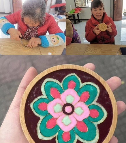 在掐絲琺瑯手工制作中,志愿者老師為大家講解了掐絲琺瑯的歷史淵源、發(fā)展歷程和掐絲等工藝流程。婦女阿姨們躍躍欲試,在老師的指導(dǎo)下,每個人都小心地拿起金絲線,按照底板的輪廓勾勒出一個一個線條,掐絲、注膠、調(diào)沙、上色,在一個半小時的制作過程中,大家相互交流,互幫互助,興致盎然,盡情享受著親手創(chuàng)作的樂趣。