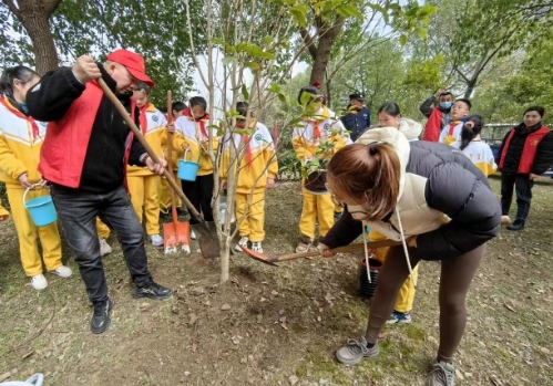 在老黨員的帶領(lǐng)下,孩子們領(lǐng)取了樹苗、鋤頭、鏟子、桶子等工具開始種樹。黨員和孩子們?nèi)艘唤M,五人一群,揮鍬培土、提水澆灌,齊心協(xié)力把一棵棵象征著廉潔的小樹苗栽在綠地上。