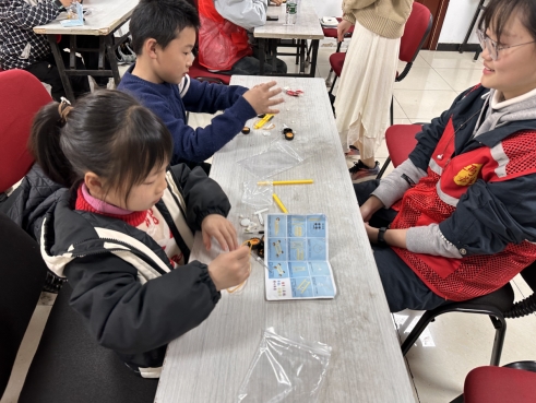 理論知識(shí)的學(xué)習(xí)結(jié)束后,龔然琪同學(xué)給未成年人們發(fā)放實(shí)驗(yàn)材料,在志愿者們的幫助下,每位未成年人都成功地制作出一輛彈簧車,切身感受到彈性勢(shì)能與動(dòng)能的轉(zhuǎn)換過程,體會(huì)到了能量守恒定律的神奇之處。