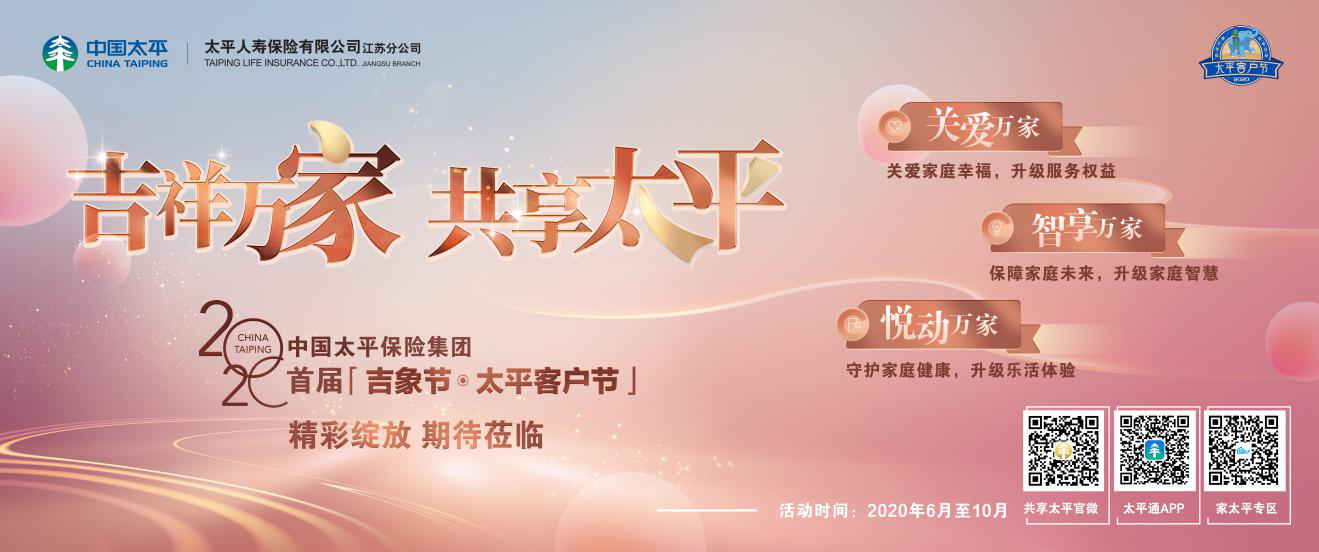 中國太平首屆“吉象節(jié)-太平客戶節(jié)”,圍繞“吉祥萬家,共享太平”主題,特設(shè)“關(guān)愛萬家”、“悅動萬家”、“智享萬家”三大版塊,打造溫情回饋、健康運動、教育智囊系列活動,將吉祥如意傳遞到千家萬戶,為每一個家庭帶去歡樂與幸福。
