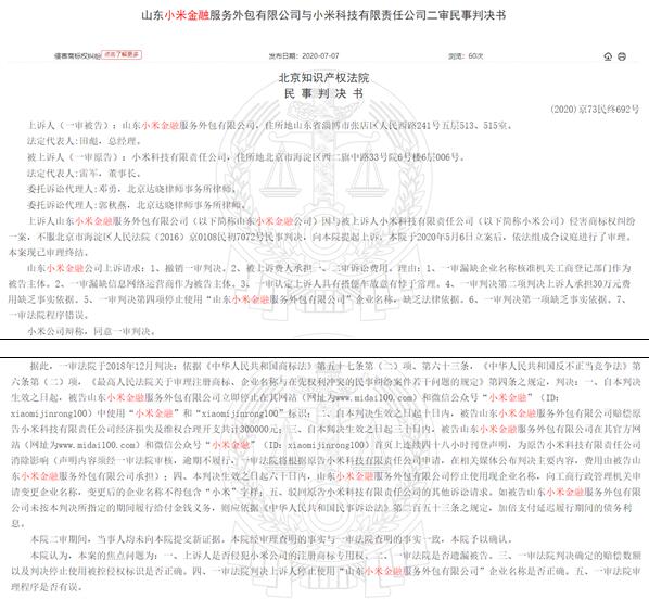 7月7日,北京知識(shí)產(chǎn)權(quán)法院發(fā)布民事判決書,對山東小米金融服務(wù)外包有限公司、小米科技有限責(zé)任公司之間的糾紛做出二審判決。